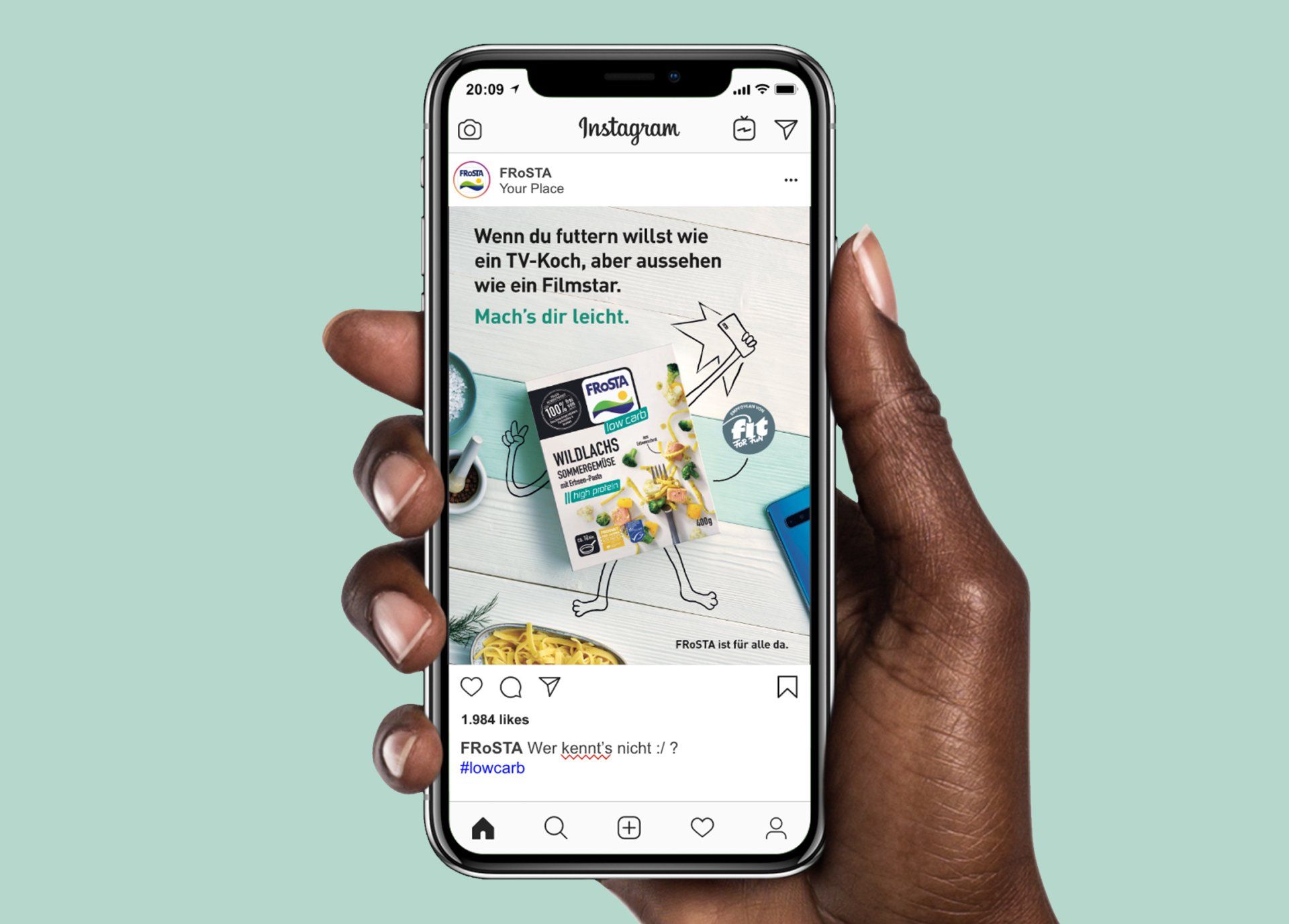 2019-2019 | Hamburg | Wynken Blynken & Nod | Our first task with winning FRoSTA as our new client was twofold. First: market the new innovation of paper bags for frozen products instead of plastic bags in a quick and cheap way, while still getting some media buzz going. Right after that our second task was to create a new Look&Feel for their low carb product line that said something like: "Hey, why not low carb?" instead of "Go heavy lifting and get muscular." Both campaigns happened in short succession. CLIENTS: FRoSTA
